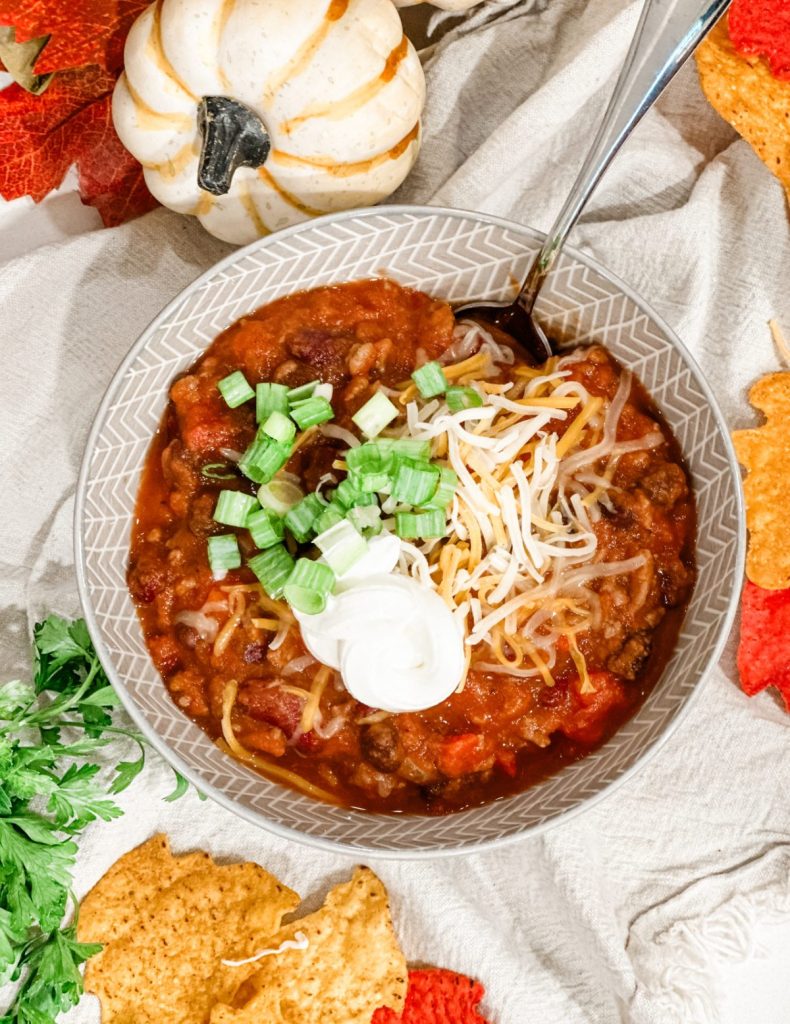 This Lightened Up Pumpkin Chili is a traditional chili that incorporates pumpkin puree-making for a delicious, hearty, fall comfort meal. Filled with warm spices, pumpkin puree, lean ground beef or turkey, beans, and diced tomatoes! All the flavors of fall!