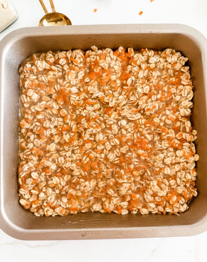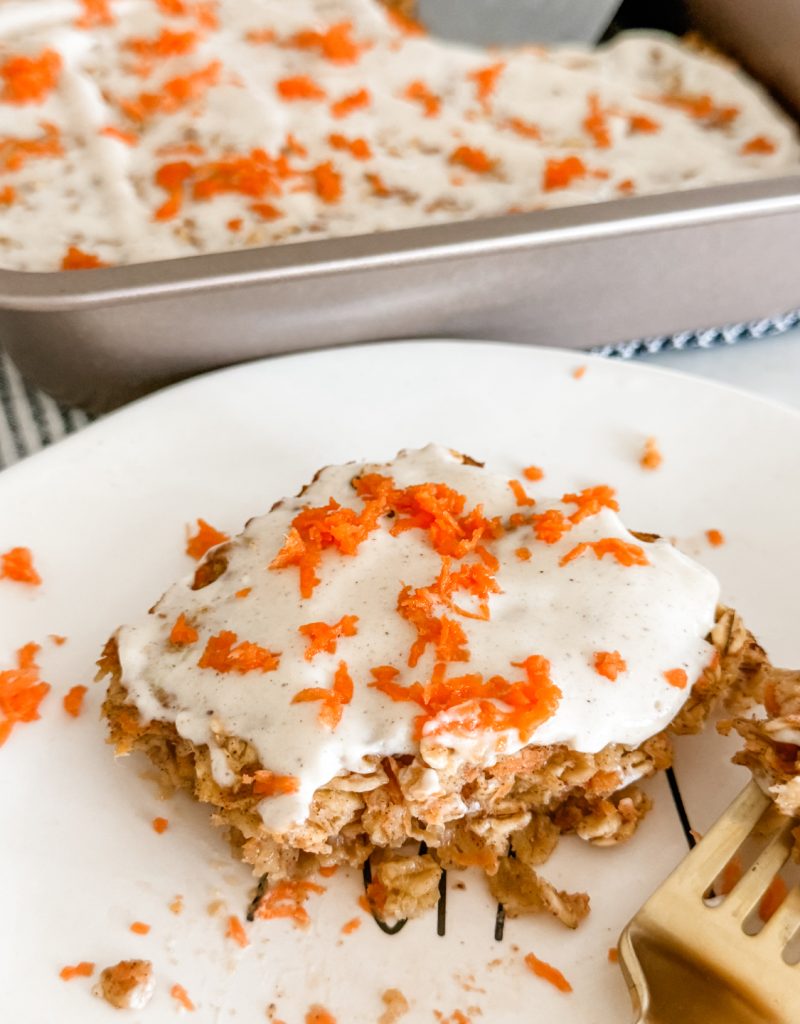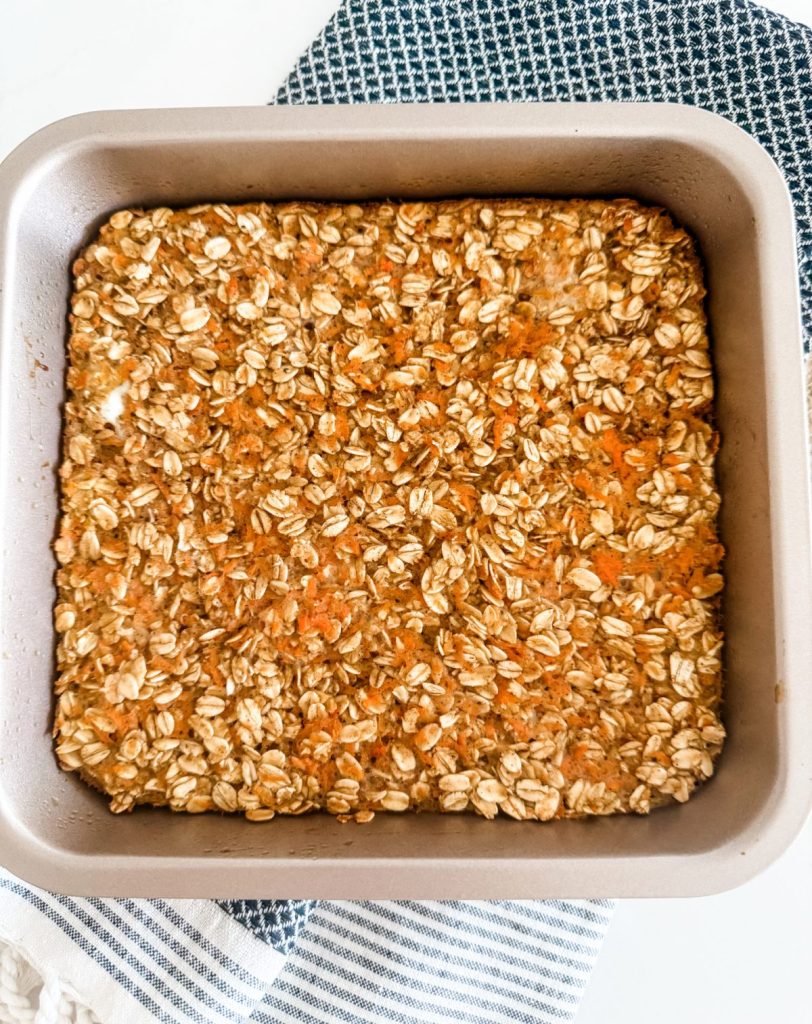 - Remove from oven and let it cool slightly. Spread frosting over the oatmeal bake. Garnish with grated carrots, if desired.