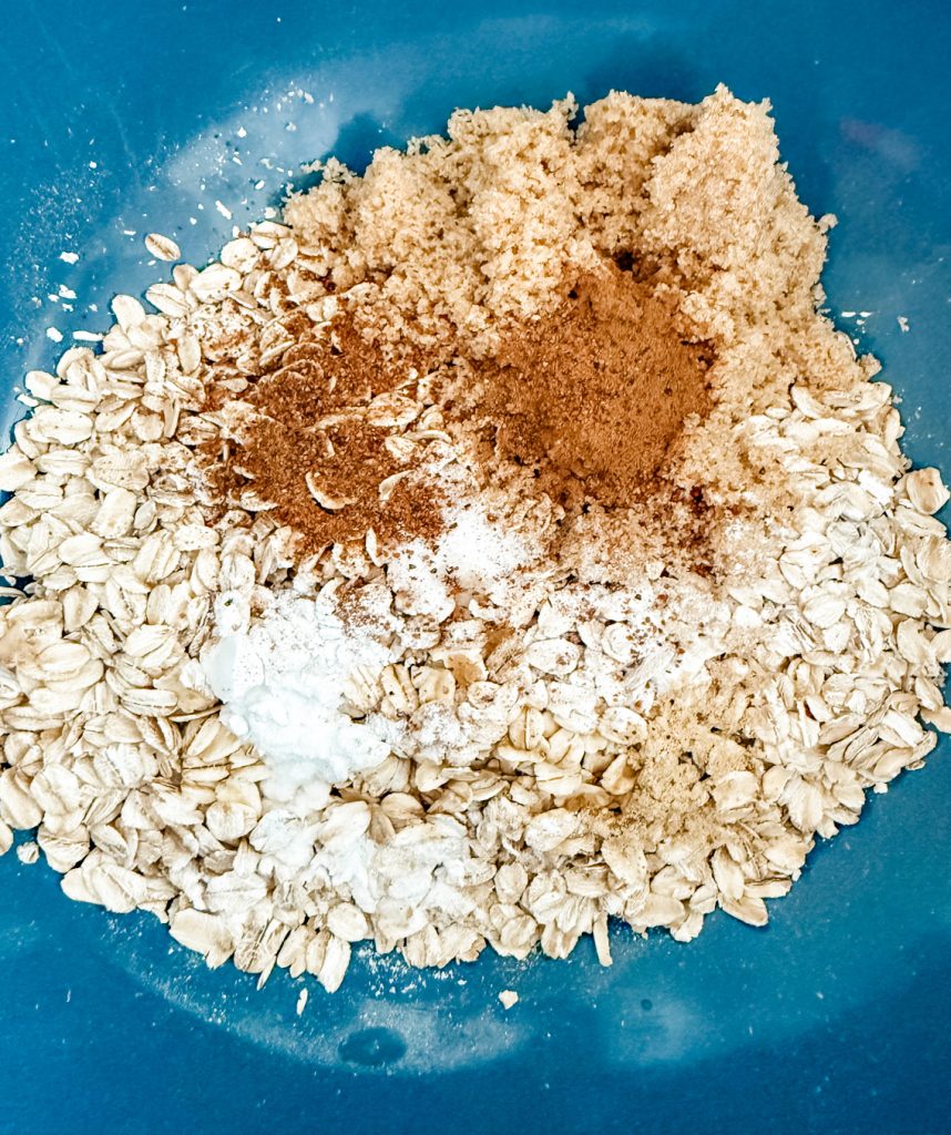 - In a large bowl, stir together the oats, sweetener, salt, baking powder, cinnamon, ginger, nutmeg and vanilla extract until combined.