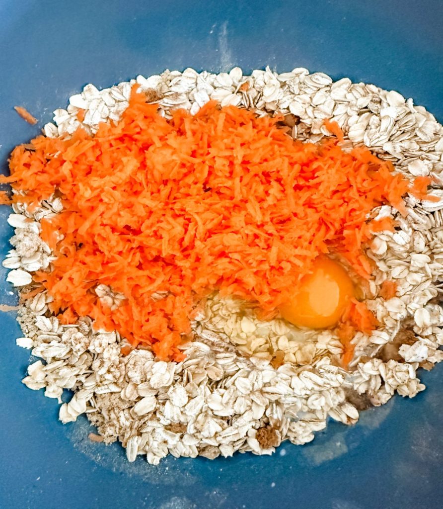 - In a large bowl, stir together the oats, sweetener, salt, baking powder, cinnamon, ginger, nutmeg and vanilla extract until combined. Whisk in egg, unsweetened applesauce, skim milk, and carrots. Whisk until well combined.