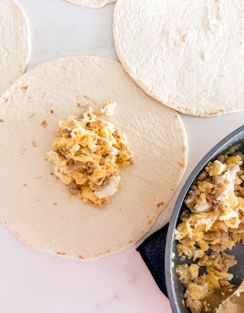 Lay out the tortillas and add a heaping 1/2 cup of scrambled eggs and sausage to the middle of each tortilla.