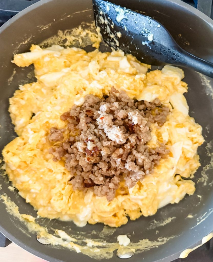 3. Remove from heat and add cooked sausage crumbles to scrambled the eggs.