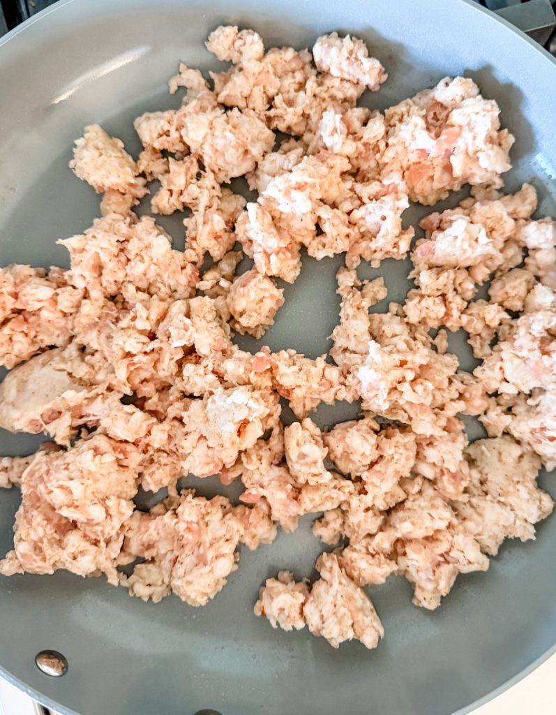 1. Spray a large skillet with cooking spray and heat over to medium heat. Add turkey sausage and break it up as it cooks. Stir until fully cooked, about 10 minutes. Remove from pan and set aside on a paper towel-lined plate.