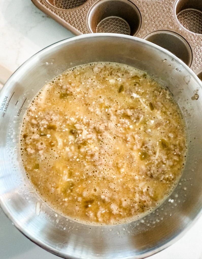 Pour the egg mixture into a large mixing bowl. Fold in cooked sausage crumbles, diced green chiles, and cheese.