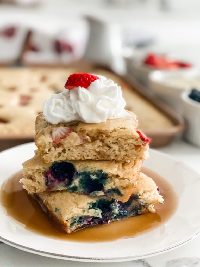 These Easy Sheet Pan Pancakes make mornings a breeze! These sheet pan pancakes are easy, simple, and a crowd pleaser! Perfect for busy weekday mornings or weekend brunch!