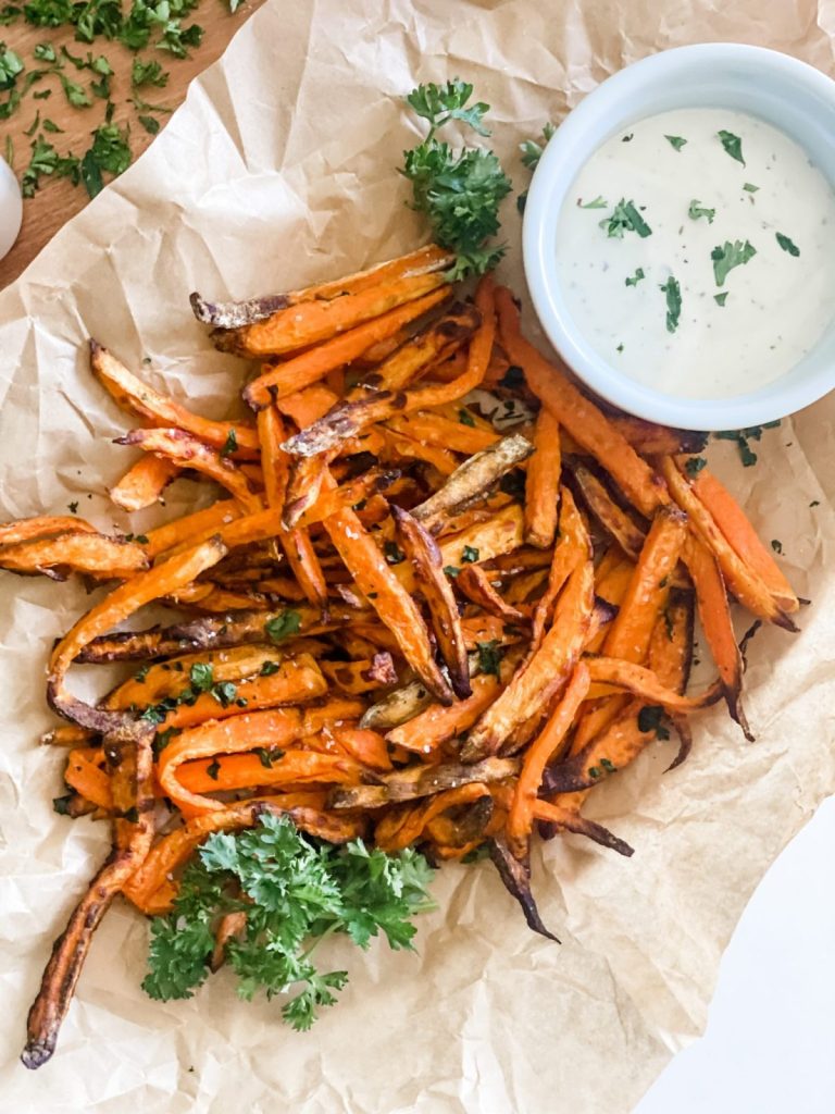 These Easy Baked or Air Fryer Sweet Potato Fries are seasoned with garlic powder, Kosher salt and baked in the oven or air fryer until extra crispy.  Serve with my homemade Skinny Ranch Dip or your favorite fry sauce! These fries are irresistibly delicious.