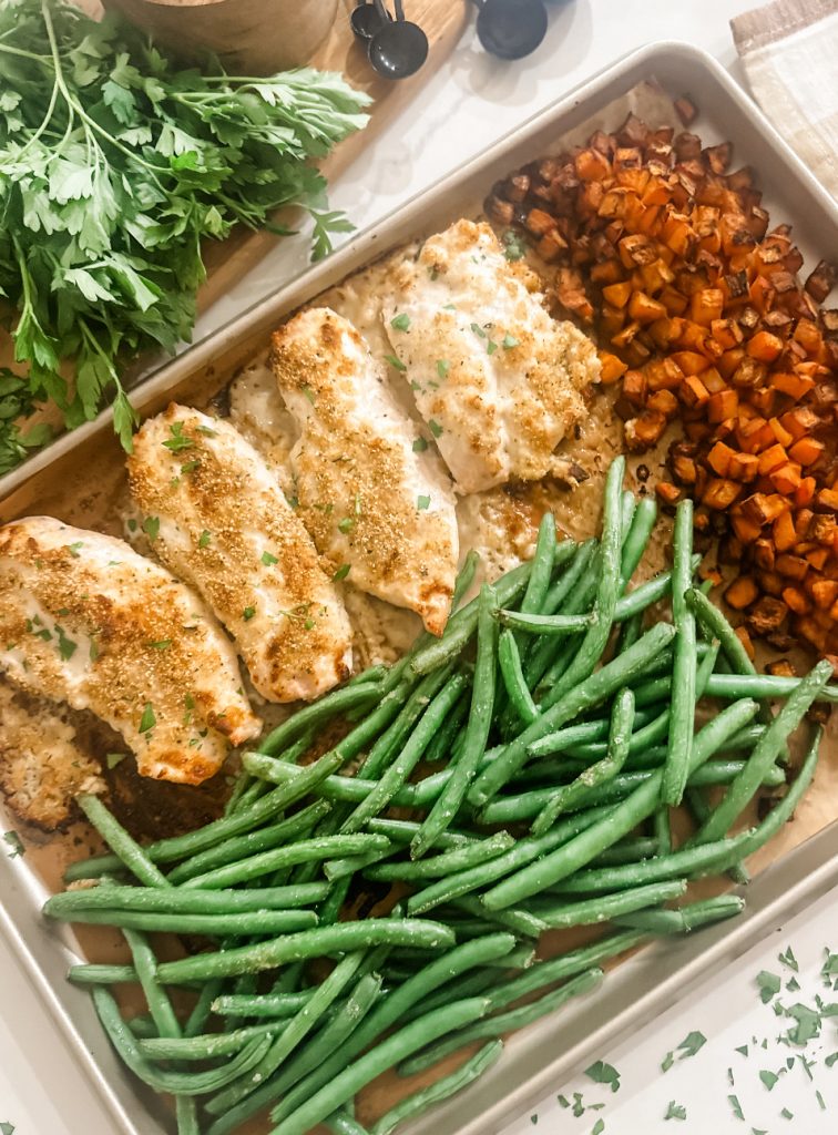 This Sheet Pan Parmesan Chicken and Veggies is a spin on our popular Greek Yogurt Parmesan Chicken. This sheet pan meal teams up with veggies on one baking sheet-making for an easy weeknight dinner! It’s easy to make, flavorful, and filling!