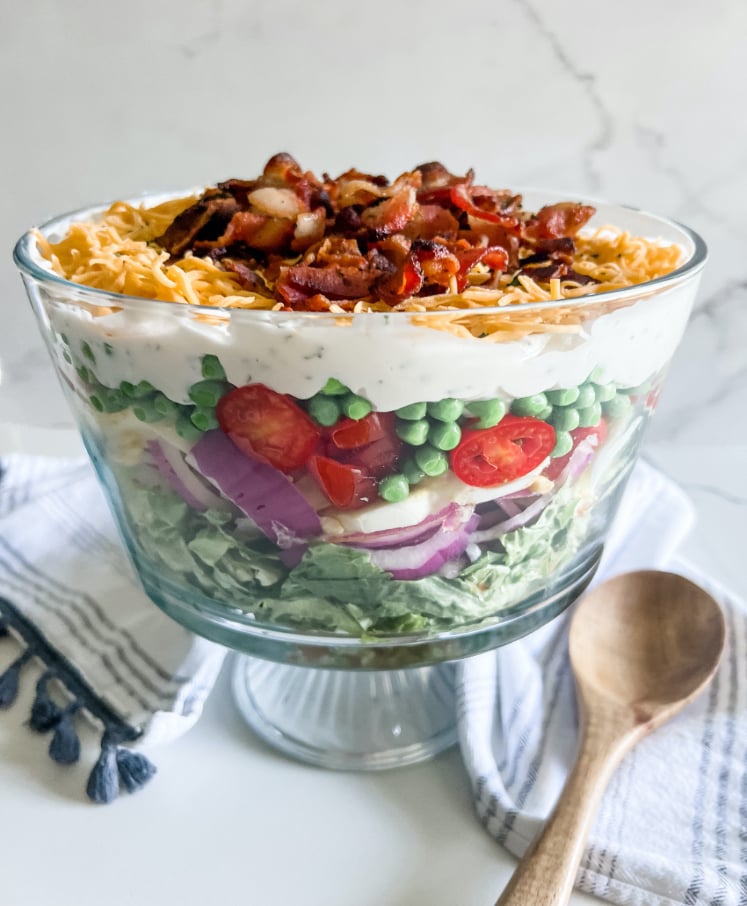 This Easy Seven Layer Salad is a classic layered salad with seven colorful layers and a homemade lightened up creamy dressing. This is an easy make ahead salad that looks and tastes amazing!