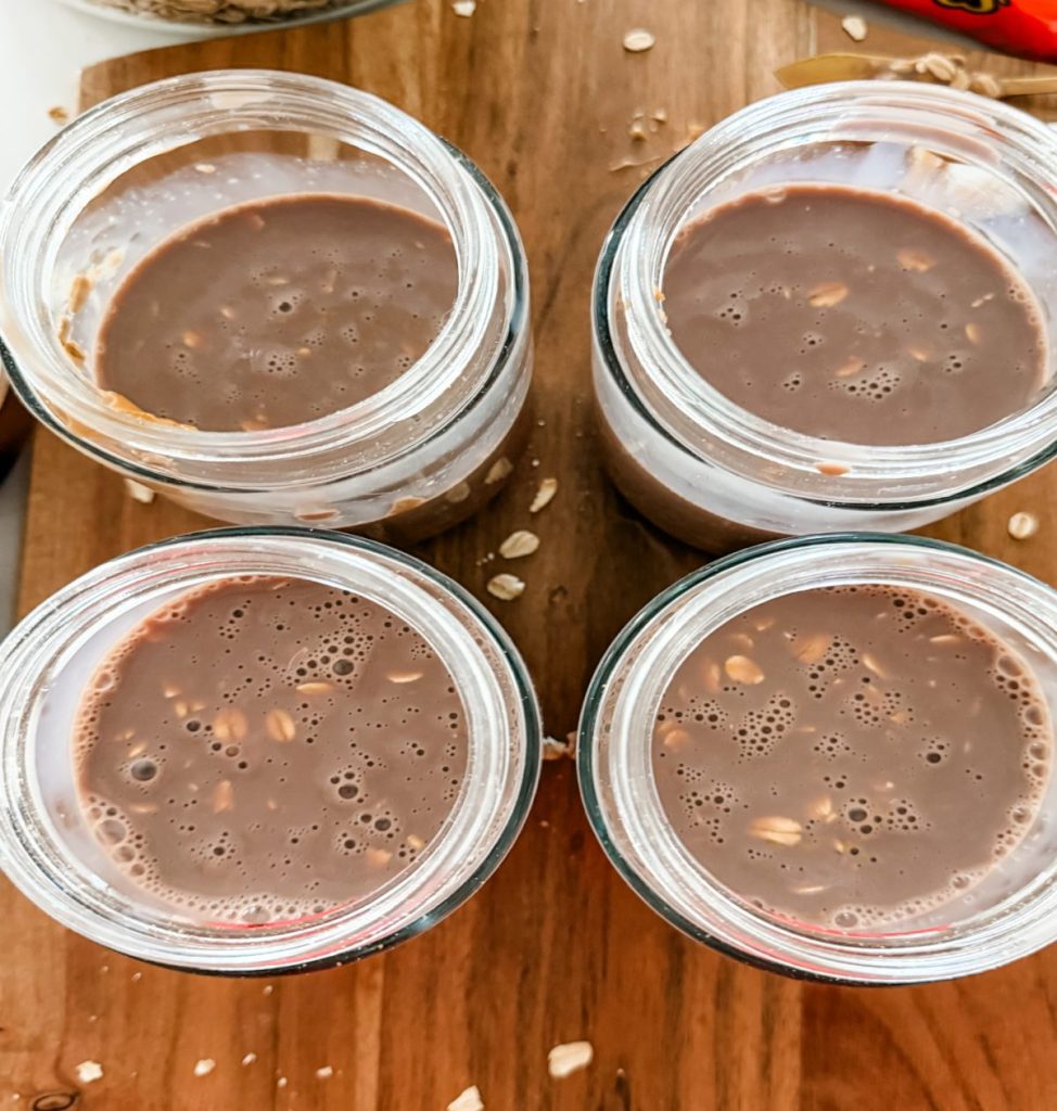 - Combine oats, milk or protein shake, and peanut butter in a 16 oz. jar.