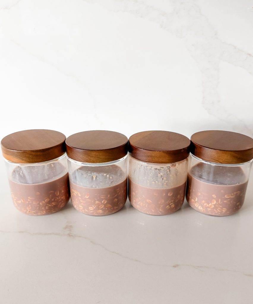 - Combine oats, milk or protein shake, and peanut butter in a jar.